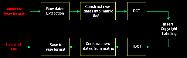 MethodsLabel is inserted into frequency domain after raw datas of audio file has been transformed using 2-dimensional Discrete Cosine Transform (DCT). The method which we implemented gives the result that label cannot be detectable by human sense. To make it happen, label contribution to signal quality has to be insignificant.